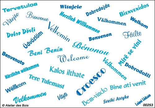 Langues de toute la planète, dialectes de France métropolitaine et d'Outremer, langues Européennes et Africaines, jouez avec les mots, les polices de caractères et les contrastes de tailles, pour souhaiter Bonjour et Bienvenue à vos visiteurs ! Mot Bienvenue en 32 langues européennes, polices et tailles différentes, bicolore. Langues : Albanais, Allemand, Anglais, Bosniaque, Danois, Espagnol, Esperanto, Estonien, Finnois, Gaëlique Irlandais, Gallois, Grec, Hongrois, Islandais, Italien, Letton, Lithuanien, Luxembourgeois, Macédonien, Néerlandais, Norvégien, Polonais, Portugais, Roumain, Sarde, Slovène, Slovaque, Suédois, Suisse Allemand, Tchèque, Wallon, Français.. Taille totale posé tel que sur l'exemple : 160 x 110 cm environ. Si vous souhaitez des tailles ou des polices spéciales, d'autres langues, une composition particulière, n'hésitez pas à nous consulter !